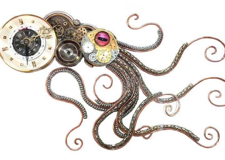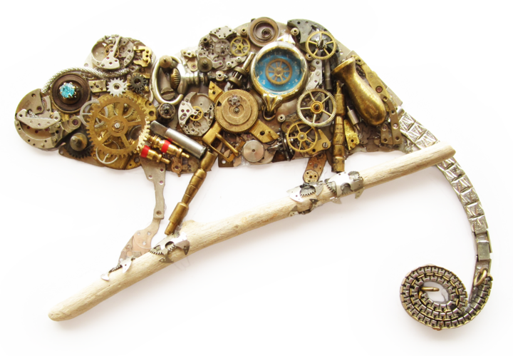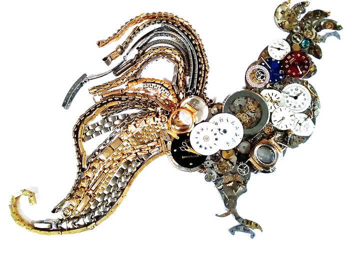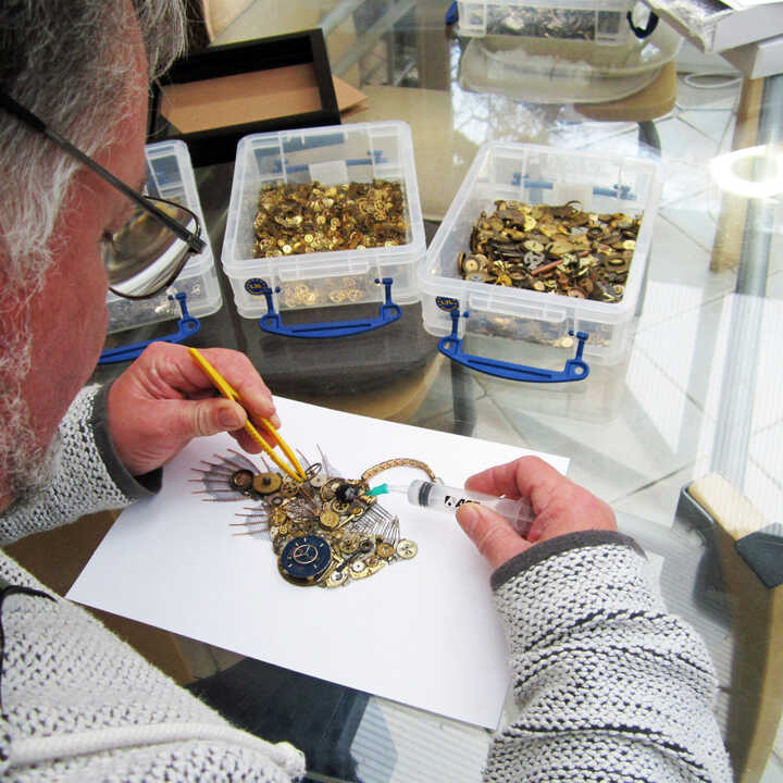 Our work has grown over the years, from painting, to jewellery, to the invention of Stoptick sculptures made from repurposed watch parts. Each creation tells a story.
